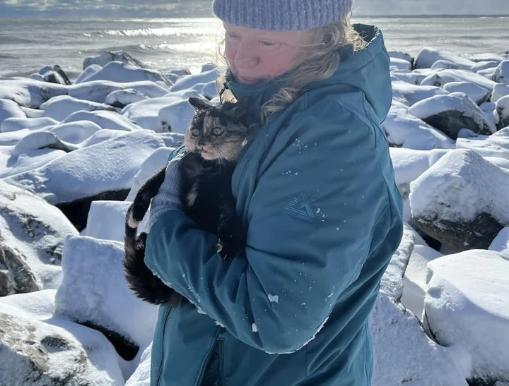 While the icy wind whipped around them, they found the kitten hiding in the rocks now covered in snow, but they couldn’t reach in far enough to get her. “Karen came up with a brilliant idea.”